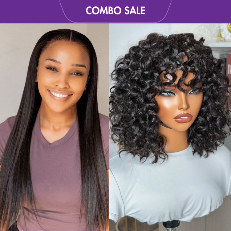 2 For 1 | Silk Straight Glueless 13x4 Frontal Lace Wig Middle Part + Water Wave No Lace Glueless Short Wig With Bangs 100% Human Hair