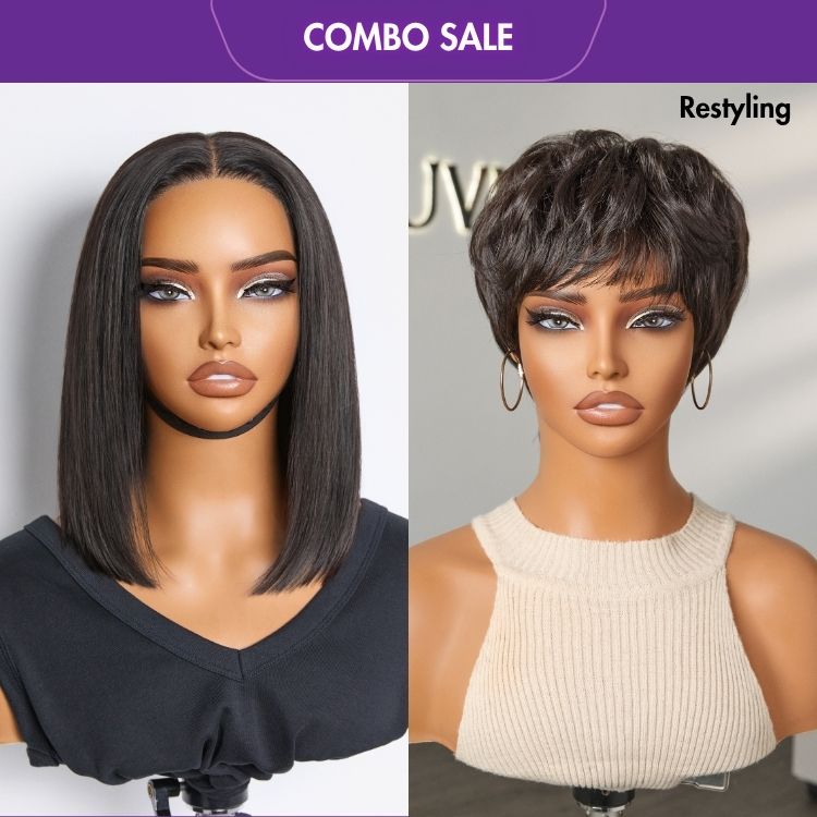 2 For 1 | 10 Inches Silky Straight Bob Glueless 4x4 Closure Lace Wig Middle Part+ Hot Pixie Cut Glueless Wig with Bangs